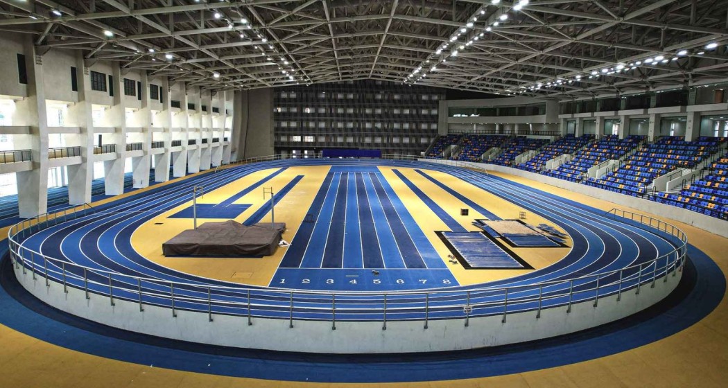 The Indoor facility at the Kalinga Stadium in Bhubaneswar has a 200m synthetic track of oval shape, a 100m straight running track (80m plus 20m), and designated areas for long jump, triple jump, pole vault, and shot put, each compliant with World Athletics Category 1 standards.